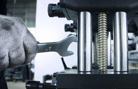 Worker in soiled gloves tightens a nut with a wrench. The repairman repairs the mechanism with a wrench.