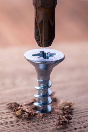 Screwdriver screw in a wood oaks plank. Self-tapping screw for PZ3 bit. Screws macro photo. Construction abstraction. Industrial background.