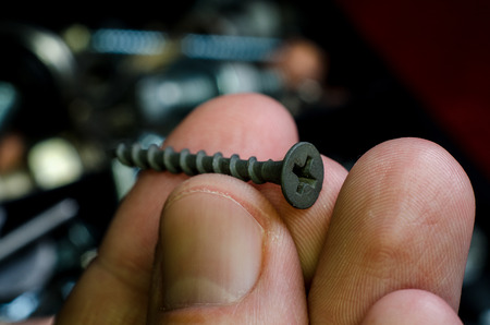 An adult male is holding an L-type screw with a dowel. A screw with a hook is used for mounting on walls, ceilings, and other surfaces. close-up. selective focus.