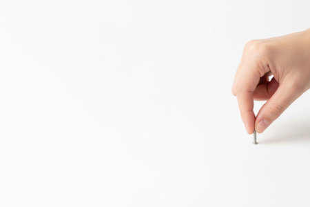 Small metal threaded screw held by Caucasian male hand between fingers. Close up studio macro shot, isolated on blue background