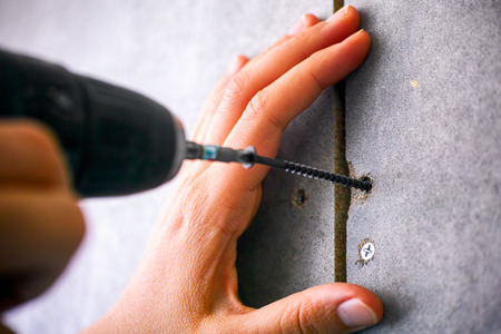 Someone is screwing a screw into wooden surface with the screwdriver. DIY concept.