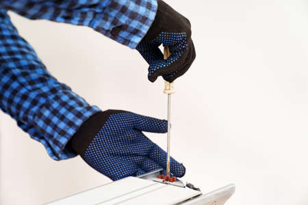 A man unscrews the bolt with a hex wrench for adjusting the miter saw, close up. Worker with Allen screw with his wrench