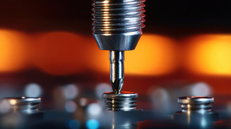 Close-up image featuring a metal tool engaging with a screw, emphasizing precision and craftsmanship in industrial environments. The vibrant background enhances the dramatic effect.