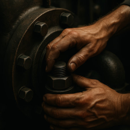 Detailed view of strong mechanic hands tightening large bolt on heavy industrial machine. Concept of maintenance strength and precision work.