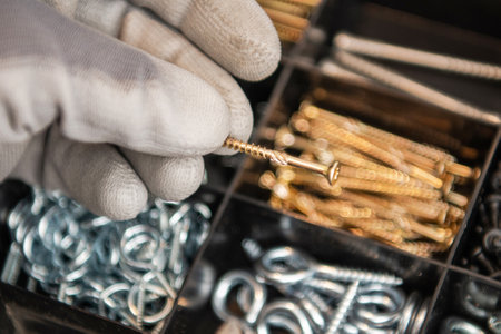 A skilled hand carefully selects screws from a wooden box filled with various fasteners. This close-up emphasizes detail and craftsmanship in DIY projects.