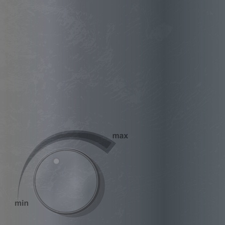 This closeup shows a shiny metal control knob. Button knob on maximum highest position. Concept of high level of something