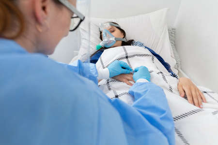 Doctor hazmat or protective suit helping to wear ventilation oxygen mask to covid infected difficulty in breathing to patient at hospital - Concept of dyspnea due to coronavirus lung infection.