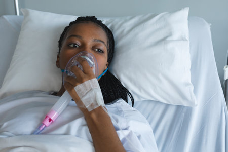 African american female patient with oxygen mask, lying on bed in hospital room. Hospital, medicine and healthcare, unaltered.