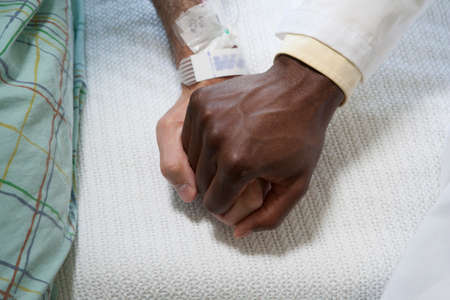 Hand of a senior female patient in a hospital bed with a catheter for infusion of medication