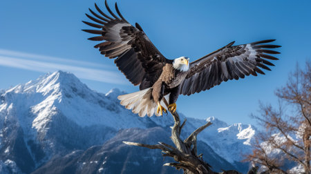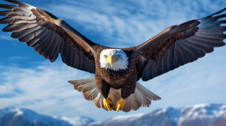 Bald eagle flying over snow-capped mountains with wings spread, displaying power and freedom