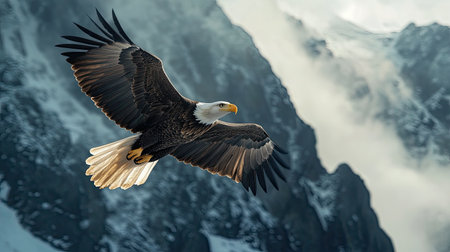 Bald eagle with outstretched wings flying gracefully above snow capped mountains under a dramatic cloudy sky. symbolizes freedom, power, and the wilderness.