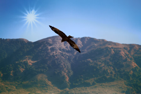 The slopes of the Siwalik ridge and a view from above of a soaring bird of prey. Mountain scenery with sun disc