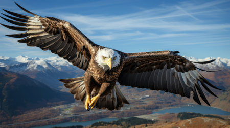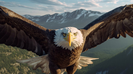 A majestic bald eagle flies over a mountain backdrop, showcasing its impressive wingspan in a stunning scene