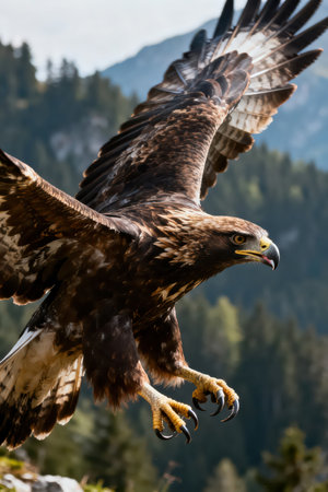 A majestic eagle is soaring through the sky above a snow-covered mountain range. Concept of freedom and power, as the eagle effortlessly glides through the air