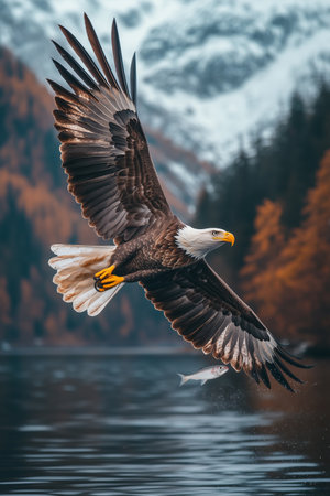 Eagle with outstretched wings gracefully glides over a tranquil mountain lake, its reflection mirrored in the water's surface