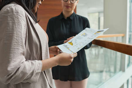 Close-up of business colleagues examining financial report and discussing it together standing at office