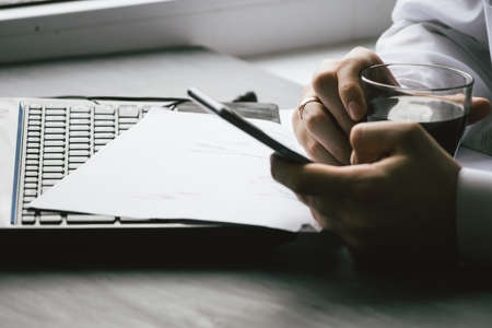 Business man drinking coffee and using laptop computer and mobile smart phone at home, young man browsing internet on phone, e commerce or online working from home, IOT internet of things concept.