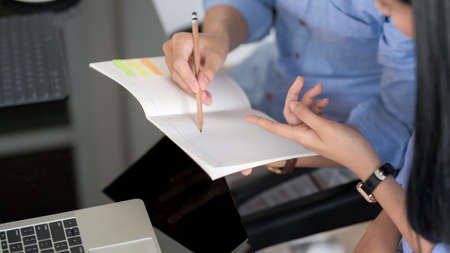 Cropped shot of two businesspeople discussing on their work while looking on notebook