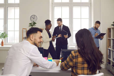 A team of young businessmen working and communicating together in an office. Corporate businessteam and manager in a meeting.