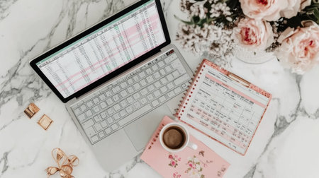 A chic workspace featuring a laptop, coffee cup, planner, and beautiful flowers on a marble table. Perfect for inspiring productivity and creativity in home office settings.