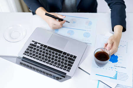 Asian female office worker typing on her laptop and working on business charts and mobile phone