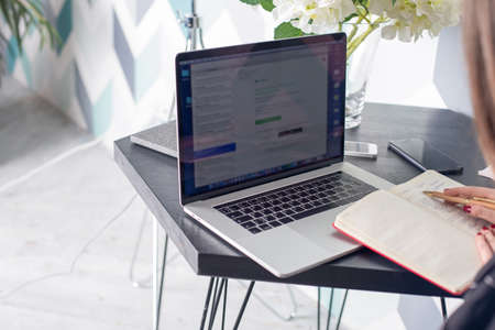 Businesswoman working in internet using laptop computer and notebook sitting in coffee shop. University student learning online via portable net-book. Financier planning.
