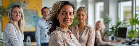 Portrait of smiling businesswoman looking at camera in office with colleagues on background