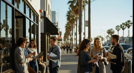 Confident, stylish, attractive colleagues in casual outfits having coffee break, talking, discussing, using smart phone, having mugs, cups with tea, partnership, relationship, community