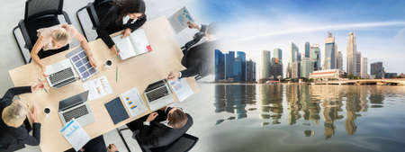 Business people group meeting shot from top widen view in office . Profession businesswomen, businessmen and office workers working in team conference with project planning document on meeting table .