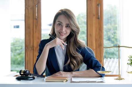 Lawyer's Office. Scales and hammer Asian female lawyer working with legal documents, advice and justice concepts.