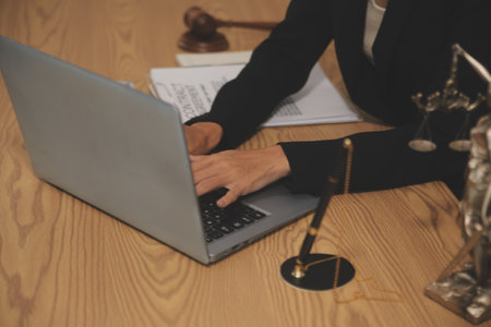 justice and law concept.Lawyer workplace with laptop and documents with dark wooden