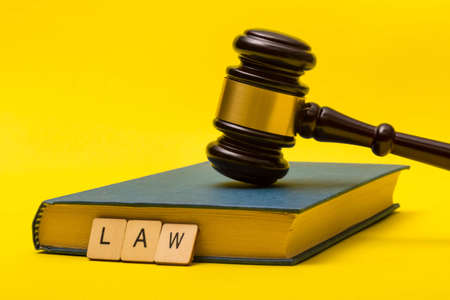 A wooden dice with a text law. Selective focus on the gavel with a yellow background. Law and Order Concept