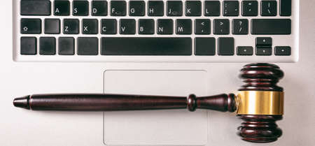 Cyber law or online auction concept. Judge gavel isolated on a computer keyboard top view, background.