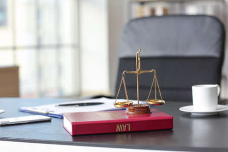Scales of justice and book on table