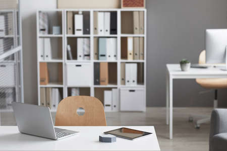 Image of empty workplace with laptop and bookcase in the background at modern office