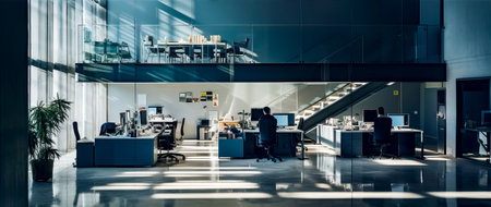 An expansive and stylish modern office space filled with natural light, featuring multiple workstations and comfortable seating areas.. AI Generation