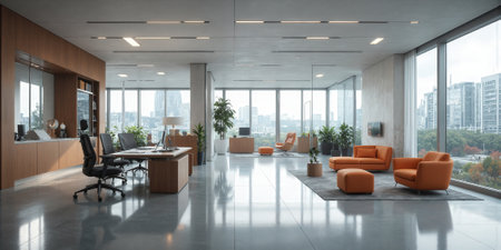 Luxury office interior with panoramic window and city view