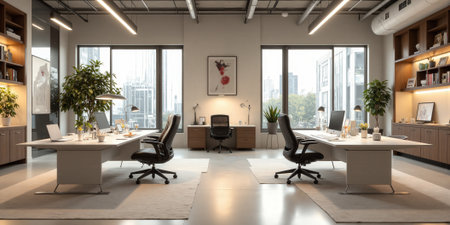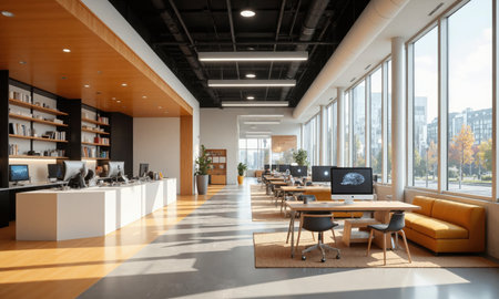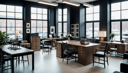 A well-lit, spacious co-working office space with stylish furniture, large windows, and an inviting atmosphere for collaboration and productivity.. AI Generation