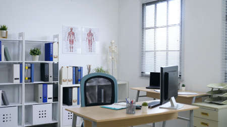 interior of the modern bright clinic office room with computers, human body anatomical chart on the wall and shelves that hold folders.