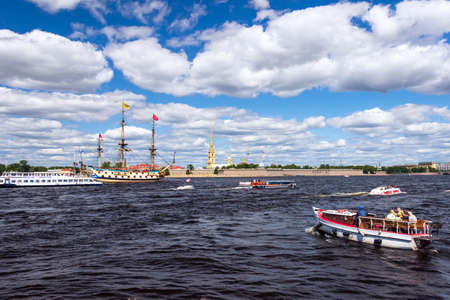 St. Petersburg, Russia - July, 24,2021: Accumulation of water transport modes on the Neva River in St. Petersburg. View of the Neva River from the embankment.