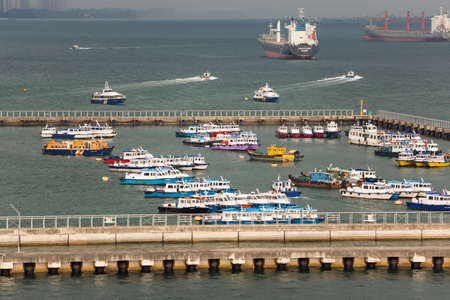 Hong Kong, China - May 12, 2010: Yellow roofed sampan travels in the old central harbor. Wide shot over water. Silver sky and black water. Tall highrise buildings on shore. Green foliage.