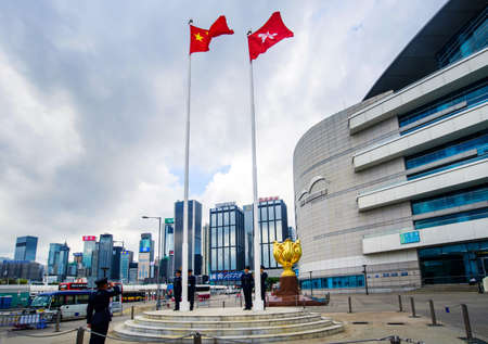 Hong Kong - August 9, 2018: Soldiers performing China and Hong Kong flag rising ceremony at the Golden Bauhinia Square