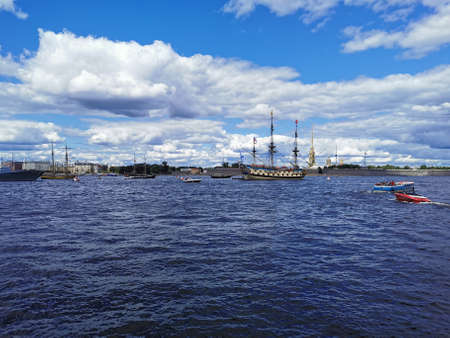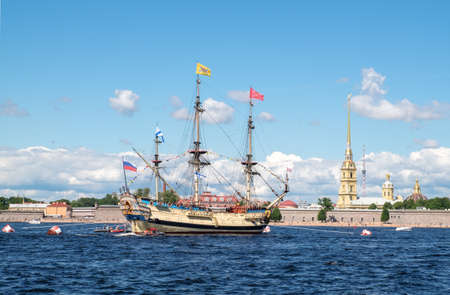 St. Petersburg, Russia. - July 26, 2020. A reconstructed old historic sailing ship stands on a raid on the Neva on the day of the Navy. Horizontal orientation, selective focus.