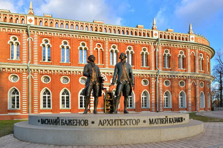 Moscow, Russia - October 16, 2019: Monument to the famous architects Vasily Bazhenov and Matvey Kazakov in Tsaritsyno Park. Tsaritsyno Park is popular historical place in Moscow