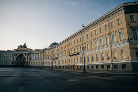 Saint Petersburg, Russia - February 2021: Palace Square and Winter Palace (The Hermitage) through Triumphal Arch. high quality photo