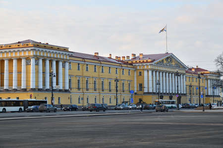 Saint Petersburg, Russia - January 31, 2020: Winter view on the Admiralty building from Palace Square shown at sunset