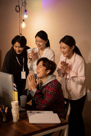 Great job. Successful business team is clapping their hands in modern workstation, celebrating the performance of new product
