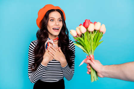 Photo of young girl happy positive smile surprised get flower bouquet hands on chest grateful isolated over blue color background
