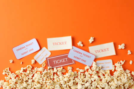 Flat lay composition with popcorn and tickets on orange background, copy space