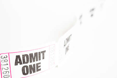 Single white vintage admission ticket on top of a red ticket isolated on white background